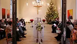 Die Kirche ist ein kleiner, klassizistischer Saal mit einbezogenem Westturm, bezeichnet 1853. Im Turm hängen drei Gussstahlglocken, das älteste Stahlgeläut Deutschlands.[3] Die Kirche wurde in über 150 Jahren mehrfach renoviert, um sie der wachsenden Gemeinde und veränderten liturgischen Bedürfnissen anzupassen: Die Kirche erhielt eine Orgelempore, einen Sakristeianbau, die Kirchenfenster wurden verändert und zwei Glasfenster wurden mit biblischen Motiven des Malers Jakob Schwarzkopf (1926–2001) gestaltet. Bei der letzten Renovierung 2001/2002 wurde die Kirche außen mit einem Farbkonzept in hellem Beige, zartem Gelb und zwei Grautönen neu gefasst, das den menschenfreundlichen und zugewandten Gott symbolisiert. Im Inneren wurde die dunkle Holzdecke aus den 1970er-Jahren entfernt. Dadurch wurden die hellen klassizistischen Kassetten wieder sichtbar. Der Kirchenraum wurde modern gestaltet. Statt Kirchenbänken kann die Bestuhlung aus einzelnen Stühlen flexibel angeordnet werden.