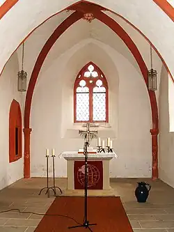 Die Kirche besitzt eine hölzerne Kanzel mit Ölbildern der vier Evangelisten.