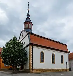 Bei der Kirche handelt es sich um einen Putzbau mit Mansarddach, das auch um den dreiseitigen Chor herumgeführt ist. Über der Fassade befindet sich ein Dachreiter mit aufwendig geschweiftem Aufsatz. 1887 wurde das rundbogige Fassadenportal restauriert, 1959 und 1960 der Innenraum mit Holzdecke und umlaufender Empore. Die Orgel wurde 1785 von Johann Georg Geib erbaut.