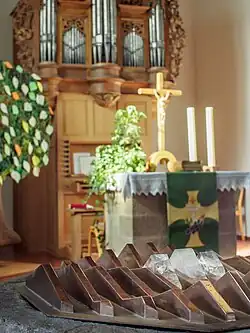 Die Orgel von 1737 und 1782 erweiterte Orgel der Orgelbauerfamilie Stumm stammt ebenfalls aus dem Vorgängerbau. Sie wurde im Neubau hinter den Altar versetzt[3] und 1904 stark verändert.