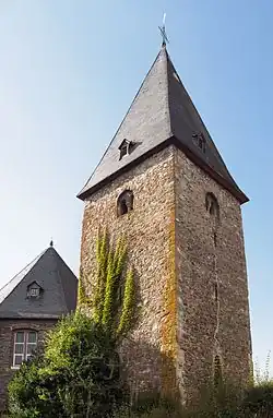 Der heutige, vermutlich aus der 2. Hälfte des 13. Jahrhunderts stammende Kirchturm ist der ehemalige Chorturm von 1290 des Vorgängerbaus. Der Turm steht heute östlich der Kirche und ist mit dieser durch einen Anbau verbunden. Der ungegliederte Turm besteht aus heute unverputztem Bruchsteinmauerwerk. Im Glockengeschoss befinden sich Schallfenster in Form gekuppelter Rundbogenarkaden. Das Pyramidendach stammt aus der Zeit um 1600. Innen im Erdgeschoss des Turms, dem Chor des Vorgängerbaus, befinden sich gotische Fresken aus dem 14. Jahrhundert. Sie zeigen Majestas Domini, Evangelisten und Heilige. Dort war auch ein römischer Viergötterstein.[3]