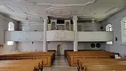 Der Innenraum, der mit einer Flachdecke überspannt ist und eine Empore im Westen hat, wurde 1710 umgestaltet.