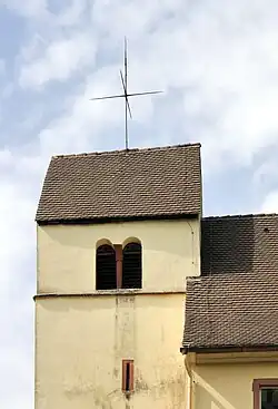 Der am Langhaus angebaute viergeschossige romanische Glockenturm im Westen ist nur unwesentlich höher als der First des Langhauses. Damit wirkt der Turm sehr massiv und gedrungen. Durch das Hauptportal im Westen gelangt man über die Turmhalle im unteren Geschoss mit Tonnengewölbe ins Langhaus. Der Turm mit Eckquaderung hat im zweiten und dritten Geschoss schmale Mauerschlitze. Im obersten Geschoss hat er rundbogige, zweigeteilte Klangarkaden mit Maßwerkverzierungen.