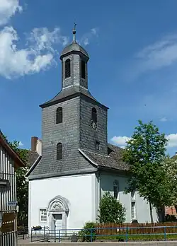 Die Ursprünge der Kirche liegen im Dunkeln. Ein Vorgängerbau, eine mittelalterliche Kapelle, die später erweitert wurde, muss auf Grund eines alten Mauerteils bereits um das Jahr 1300 erbaut worden sein. Die spätgotische Saalkirche wurde 1513 erbaut, diese Jahreszahl 1513 ist in römischen Ziffern am Portal angebracht. 1827 wurde das Kirchenschiff nach Westen verlängert und mit einem Chor mit dreiseitigen Abschluss versehen. Teile des alten Portals von 1513 wurden im neuen wieder eingebaut. Außerdem erhielt das Satteldach einen schiefergedeckten Dachturm mit einer Laterne, der den Glockenstuhl mit einer 1477 gegossenen Kirchenglocke und die Turmuhr beherbergt.