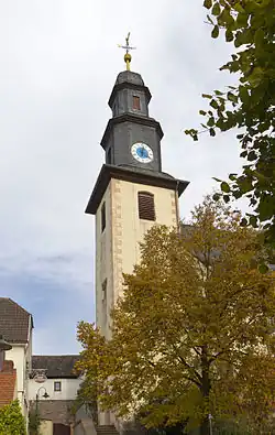 Die Saalkirche mit dreiseitigem Schluss im Osten wurde 1738/39 gebaut. Die unteren Geschosse des quadratischen Kirchturms im Westen sind gotischen Ursprungs. Sein oberstes Geschoss beherbergt hinter den Klangarkaden den Glockenstuhl. 1747 erhielt der Turm einen schiefergedeckten, achteckigen Aufsatz, in dem sich die Turmuhr befindet. Darauf sitzt ein eingezogener, achteckiger Aufsatz, der von einer glockenförmigen Haube bekrönt wird. Im Innenraum wurden 1779 Emporen eingebaut, deren Brüstungen bemalt sind. Die Orgel mit 12 Registern, 2 Manualen und Pedal wurde von der Walcker Orgelbau als opus 643 gebaut.[1]