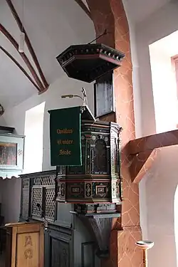 Die polygonale hölzerne Renaissancekanzel mit sechsseitigem Schalldeckel wurde um 1600 im Stil des Manierismus gefertigt.[11] Sie ist an der Südseite am östlichen Gurtbogen angebracht und reich mit Beschlagwerk verziert. Der Kanzelkorb hat an den Feldern Rundbögen zwischen Eckpilastern. Ein angeschlossener Pfarrstuhl hat im oberen Teil durchbrochenes Rautengitterwerk. Der Korpus des Altarkruzifixes ist alt.
