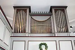 Im Jahr 1836 war eine Orgel vorhanden, die als „unansehnlich“ bezeichnet wurde.[5] Ein unbekannter Orgelbauer baute um 1870 die heutige Orgel.[7] Der neugotische Prospekt hat außen zwei überhöhte flache hochrechteckige Pfeifenfelder mit stumpfen Spitzbogen zwischen zwei Lisenen. Die Außenfelder flankieren ein niedrigeres querrechteckiges Flachfeld mit einem nach oben geöffneten Rundbogen. Das Werk verfügt über acht Register, die auf einem Manual und Pedal verteilt sind. Die Disposition lautet wie folgt:[8]