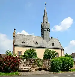 Die geostete Saalkirche ist am südöstlichen Ortsrand errichtet. Dem verschieferten Satteldach sind im Süden drei und im Norden vier kleine Gauben aufgesetzt. Östlich der Mitte trägt es einen hohen, oktogonalen, verschieferten Dachreiter, der noch spätgotische Formen aufweist.[7] An den acht Seiten des Schaftes sind je zwei kleine rechteckige Schallöffnungen für das Geläut eingelassen. In westliche Richtung weisen die beiden Zifferblätter der Turmuhr. Aus acht steilen Giebelchen mit kleinen Spitzen entwickelt sich der Spitzhelm, der von Turmknauf, Kreuz und vergoldetem Wetterhahn aus Kupferblech bekrönt wird. Das Mauerwerk ist außen weiß verputzt, wobei Gewände, Eckquaderungen und der Abschluss des Westgiebels aus rotem Sandstein ausgespart sind. Die barocke Kirche erhielt durch die Erweiterung zu Beginn des 20. Jahrhunderts ein neobarockes Gepräge, das besonders in dem geschwungenen Westgiebel sichtbar wird. Drei Fenster mit Glasmalerei stammen aus dieser Zeit des Umbaus 1905. Ein Fenster im Altarbereich zeigt die Taufe Jesu, das andere Christi Himmelfahrt. Das Rundfenster über dem Westportal zeigt Christus als den guten Hirten mit Hirtenstab und erhobener Hand zum Segensgruß.[6]