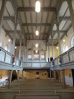 Das Langhaus ist durch Reihen von Holzpfeilern in drei Schiffe unterteilt, beide Seitenschiffe mit Emporen gefüllt. Alle decken sind flach, aber das Mittelschiff etwas höher als die Seitenschiffe, also eine stufen- und Emporenhalle.