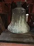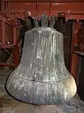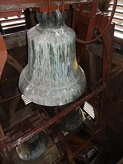 Der Turm beherbergt ein Dreiergeläut. Andreas Hamm aus Frankenthal goss im Jahr 1878 drei Glocken mit einem Durchmesser von 900, 700 und 600 mm. 1917 wurden die beiden größten an die Kriegsrüstung abgeliefert, die dritte wurde 1920 in Zahlung gegeben, als man ein neues Geläut anschaffte.[12]