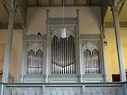 Über eine Orgel in der Vorgängerkirche ist nichts bekannt. Im Jahr 1863 wurde Johann Georg Förster mit einem Neubau beauftragt, den er zweieinhalb Jahre später fertigstellte. Das Instrument verfügt über zwölf Register, die auf zwei Manualen und Pedal verteilt sind. Durch Transmission (Doppelschleifen) sind die Register des Hauptwerks auch im Pedal spielbar. Die Disposition lautet wie folgt:[11]