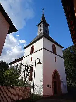 Ältester Baukörper ist der frühgotische Turm auf quadratischem Grundriss, der seit dem Umbau im 19. Jahrhundert als Eingangsraum fungiert und in die Südostecke des Kirchenschiffs führt. Das überwölbte Untergeschoss hat ein Kreuzgewölbe mit gekehlten Rippen, die auf verschiedenförmigen Spitzkonsolen ruhen. Der Schlussstein ist mit dem Gotteslamm belegt. Der spitzbogige Triumphbogen im Westen ist bis auf eine sekundär eingelassene Durchgangstür zugemauert, deren sieben Stufen zum Schiff hochführen. An der Ostseite ist unter einem ausgemauerten Bogen (für die ursprüngliche Apsis) die spitzbogige Eingangstür eingelassen. Das kleine Spitzbogenfenster an der Nordseite wird durch die Sakristei verdeckt. Das größere, ursprünglich zweiteilige Spitzbogenfenster in der Südwand hat abgeschrägte Gewände aus Lungstein.[6] Mittelpfosten und Maßwerk sind entfernt, der Bogen aus Sandstein stammt aus späterer Zeit. Die südliche, wohl rundbogige Priestertür ist vermauert. Unter dem Teilungsgesims sind schmale spitzbogige Schlitze eingelassen, über dem Gesims, im ehemaligen Glockengeschoss, an jeder Seite Spitzbogennischen mit zweiteiligen Öffnungen. Der Helm von 1864 ist verschiefert und leitet pyramidenförmig zu einem schmalen quaderförmigen Mittelteil mit kleinen Schalllöchern in zwei Ebenen über. Darüber erhebt sich ein achtseitiger Spitzhelm, der von einem Turmknauf, Kreuz und einem vergoldeten Wetterhahn, der 2020 erneuert wurde, bekrönt wird.[5]