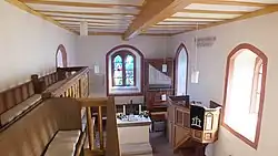 Der Innenraum wird von einer flachen Holzbalkendecke mit ockerfarben gestrichenem Längsunterzug abgeschlossen, der auf einem runden, hölzernen, rot marmorierten Mittelpfosten ruht. Die Bezeichnung mit dem Jahr 1792 auf den beiden Kopfbügen weist wahrscheinlich auf eine Erneuerung. Die zweiseitige Empore geht im ältesten, westlichen Teil auf das Jahr 1618 zurück.[11] Die Empore an der nördlichen Langseite wurde 1726 eingebaut und später verlängert. Die 27 Bilder in den Füllungen, die 1906 saniert wurden, sind nicht erhalten.[12]