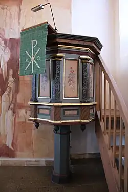 An der nördlichen Chorwand ist eine Inschrift mehrfach erneuert worden und nur fragmentarisch erhalten,[18] lautet vermutlich aber: „Ach lass du hirt mich besen / Durch Christi Leip und bluth genesen“.[19] In der Turmhalle steht seit dem Kirchenneubau ein tischförmiger Altar, der aus eisernen Vierkantrohren und Holzplatten gefertigt ist.[10] Auf dem Altartisch steht ein hölzernes Altarkreuz mit Kruzifix von 1893. Der polygonale hölzerne Kanzelkorb vor dem südlichen Chorbogen ruht auf einer achtseitigen Säule. Die Kanzelfelder zeigen zwischen schwarz marmorierten Ecksäulen Blumenranken. Die umlaufenden Kranzgesimse sind vergoldet. Am nördlichen Chorbogen ist der vierseitige Taufstock und in der Nordostecke ein hölzernes Lesepult aufgestellt. Das Kirchengestühl besteht aus breiten Bänken in dunkelgrüner Fassung, die einen Mittelblock bilden.