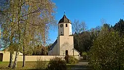 Die Saalkirche wurde 1604 von einem Angehörigen der süddeutschen Adelsfamilie Woellwarth gestiftet, deren Wappen in der Bekrönung des Portals angebracht ist. Sie besteht aus dem Langhaus und dem Kirchturm im Westen, der im achteckigen Obergeschoss die Turmuhr und den Glockenstuhl enthält und mit einer Glockenhaube bedeckt ist.