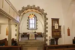 Der Chorbogen und die Gewände der Chorfenster und der Südtür sind mit Diamantquaderung (um 1600) bemalt.[9] Das Kreuzgratgewölbe im Chor hat oben in den Gewölbekappen Rankenmalereien.