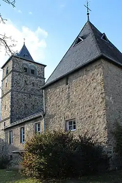 Der in etwa geostete Saalbau ist im alten Ortszentrum an einer Kreuzung errichtet. Während die Mauern des Ostturms und des alten Kirchenschiffs aus unverputztem Bruchsteinmauerwerk aus Grauwacke aufgeführt sind, sind der Westturm und das neue Kirchenschiff aus Backstein und Porenbeton mit einer Verkleidung aus Bruchstein erbaut.[1]
