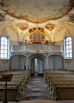 Der Innenraum des Oktogons ist mit einem Spiegelgewölbe überspannt. Die Deckenmalerei mit der Darstellung der heiligen Katharina stammt von Johann Pfunner. Die Kirchenausstattung stammt aus der zweiten Hälfte des 18. Jahrhunderts. Die Orgel auf der Empore mit 16 Registern auf zwei Manualen und Pedal wurde 1999 als Opus 154 von Jürgen Ahrend Orgelbau errichtet. Der Prospekt ist eine Kopie der Silbermann-Orgel auf Schloss Burgk. Außerdem besitzt die Kirchengemeinde eine Truhenorgel des gleichen Erbauers.[1]