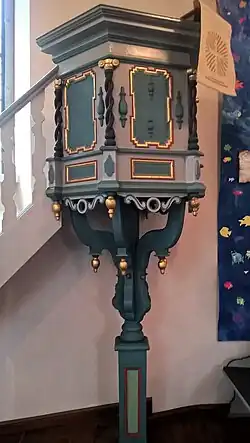 Die polygonale, hölzerne Kanzel stammt aus der Bauzeit der Kirche. Sie wird von geschwungenen Bügen gestützt, an denen vergoldete Spitzen hängen. Der Kanzelkorb ist mit Beschlagwerk verziert. Ihm entspricht der Schalldeckel, der von vergoldeten Spitzen bekrönt wird.