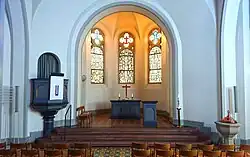 Im Altarraum sind drei Fenster des Glaskünstlers Max Lüder (1889–1952)[3] aus dem Jahr 1952 zu sehen. Dargestellt sind, wie schon auf den kriegszerstörten Vorgängern, die Geburt, die Kreuzigung und die Auferstehung Jesu.