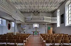 Im Inneren ist das Langhaus mit einer flachen Holzdecke eingezogen. Eine auf fünf Säulen ruhende Empore befindet sich entlang der West-, Nord- und Ostwand. Die Malereien auf Decke, Brüstung und Säule waren vor ihrer Freilegung in den Jahren 1973 bis 1974 übertüncht. Das Ölgemälde an der Südwand, das die Kreuzigung Christi darstellt, schuf 1756 der badische Hofmaler Philipp Heinrich Kisling.[3]