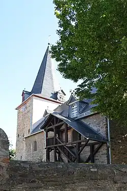Bereits im Jahre 775 hat es eine Vorgängerkirche gegeben. Die Ursprünge der heutigen romanischen Saalkirche aus Bruchsteinen gehen auf das Jahr 1204 zurück. Bauliche Erweiterungen im 17./18. Jahrhundert führten zum heutigen Bauzustand. Im Chorturm der ehemaligen Wehrkirche sind noch die Schießscharten zu erkennen. Sein Erdgeschoss und der Treppenlauf in der Mauer sind mit Kreuzgratgewölben überspannt. Seinen achtseitigen, schiefergedeckten Helm erhielt er nach 1800.