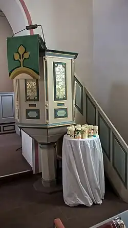 Die polygonale, hölzerne Kanzel ohne Schalldeckel ruht auf einem achteckigen Fuß und ist über den gewinkelten Kanzelaufgang zugänglich. Die fünf Kanzelfelder haben im unteren Bereich zwei kleine querrechteckige Füllungen, im oberen große hochrechteckige Füllungen, die alle hellblau gefasst sind und vergoldete Profile haben. Sie sind mit Bibelversen in Goldschrift verziert, die aus den vier Evangelien und dem Psalmen stammen: Mt 28,20 , Mk 9,23 , Mt 28,20 , Joh 14,6 und Ps 23,1 .