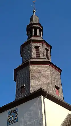 Der gedrungene Chorturm auf quadratischem Grundriss aus romanischer Zeit war ursprünglich wehrhaft, was an den Schießscharten erkennbar ist.[15] Unterhalb der Traufe sind im Norden und Süden die blauen Ziffernblätter für die Turmuhr angebracht. Über dem aufgemauerten, weiß verputzten Turmschaft, der eine Höhe von 11 Metern erreicht, vermittelt ein Zeltdach zum vollständig verschindelten Helmaufbau. Die oktogonalen Geschosse verjüngen sich nach oben und werden mit geschwungenen Hauben abgeschlossen. Die offene Laterne mit Welscher Haube wird von einem Turmknauf, schmiedeeisernen Kreuz und einem vergoldeten Wetterhahn in 25 Meter Höhe bekrönt. Die Glockenstube beherbergt zwei Glocken, von denen eine 1950 durch eine Glocke der Firma Rincker ersetzt wurde (1,02 m Durchmesser, 650 kg, Schlagton g1). Sie trägt wie ihre Vorgängerin die Inschrift: „Für die Schwester erstand ich, die dem Kriege ward geweiht, an die Helden ermahn ich, zur Seligkeit“. Die kleinere, ältere Glocke (0,85 m Durchmesser, Schlagton b1) wurde 1779 von Nic. Bernhard gegossen.[16] Das ehemalige Nordportal ist vermauert und verputzt.[17] Das Nordfenster ist spitzbogig, im Osten und Süden sind kleine Rundbogenfenster eingelassen.
