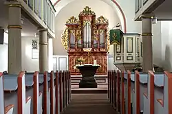 Ein großer Rundbogen öffnet den flachgedeckten Chor zum Kirchenschiff. Der Innenraum des Saals wird von einer Flachdecke mit Unterzug abgeschlossen und von einer dreiseitig umlaufenden, hölzernen Empore beherrscht, die auf sechs Säulen mit vergoldeten Wülsten ruht. Der nördliche Teil stammt noch aus der Erbauungszeit der Kirche, die Südempore wurde Ende des 19. Jahrhunderts eingebaut. Die Empore bietet etwa 100 Personen Platz. Ihre Brüstung hat kassettierte Füllungen, die hellblau gefasst sind. An der Südseite ist die Empore gegenüber der Nordseite verkürzt, um Raum für die Kanzel zu lassen, die vor dem südlichen Chorbogen aufgestellt ist.
