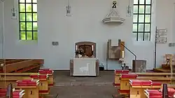 Zur Ausstattung der Kirche gehören zwei Fenster, die der ungarisch-deutsche Architekt und Kirchenfenstermaler György Lehoczky im Jahr 1953 entworfen hat. Sie tragen die Titel „Der arme Mensch“ und „Der reiche Mensch“.[7]