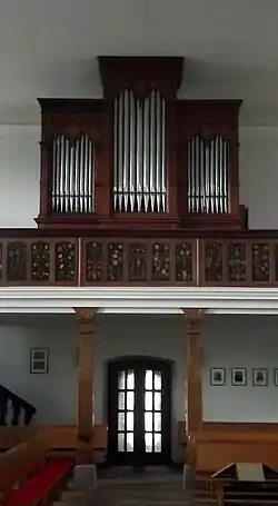 Die Orgel der Kirche wurde 1886 von den Orgelbauern Friedrich und Karl Stumm (Rhaunensulzbach/Hunsrück) erbaut. In Folge einer Umbaumaßnahme erhielt das Instrument einen neuen Spieltisch. Die Orgel verfügt über 15 Register, verteilt auf ein Manual und Pedal. Das Manual ist in einigen Registern geteilt (Bass: C-h, Diskant: c1-g3) – siehe die Disposition. Die Spieltraktur ist mechanisch, die Registertraktur elektromechanisch. Die Disposition lautet wie folgt:[8]