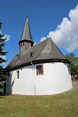 Der in etwa geostete, weiß verputzte Saalbau mit halbrundem Ostschluss liegt in Hanglage oberhalb des Ortszentrums. Oberhalb des Mauerwerks bildet ein hölzerner Aufbau mit Zahnschnitt und Bibelversen den Übergang zum verschindelten Satteldach. Das westliche Giebeldreieck ist verschindelt. Das Südportal in einem Holzrahmen wird von zwei geschnitzten Pilastern flankiert.[8] Dem Dach ist mittig ein achtseitiger, vollständig verschindelter Dachreiter mit Spitzhelm aufgesetzt. Die Glockenstube beherbergt zwei Glocken. Der Helm wird von Turmknauf, Kreuz mit Kreis und einem vergoldeten Wetterhahn bekrönt.