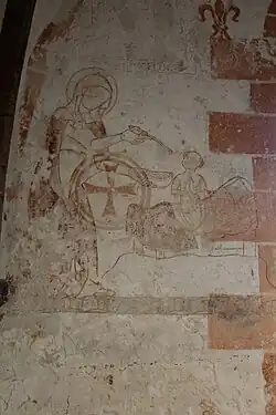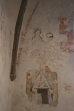 Die hochwertigen roten Wandmalereien im Chorturm stammen aus dem 14. Jahrhundert und sind nur teilweise erhalten. Die ursprüngliche polychrome Fassung ist in einem so geringen Maß erkennbar, dass eine Rekonstruktion nicht sinnvoll schien. Die Darstellungen zeigen weibliche Heilige, die teils bekrönt sind: an der westlichen Nordwand die heilige Elisabeth von Thüringen,[13] die einen alten Bettler speist, an der östlichen Nordwand die heilige Helena, an der nördlichen Ostwand die heilige Dorothea und in der Laibung des Ostfensters Maria mit dem Kind in einer Quaderbemalung. An der Südwand ist Maria Magdalena zusammen mit der heiligen Katharina zu sehen, die als ihr Attribut das Wagenrad hält. Zudem sind Lilien und Architekturmalerei sowie Weihekreuze in zwei Ebenen in unterschiedlicher Malweise dargestellt. In der Ostwand ist im Norden eine viereckige Sakramentsnische mit Wimperg eingelassen. Sie ist von bunter Wandmalerei umgeben, die spitzbogige Fenster mit Nonnenköpfen und stilisiertes Rankenwerk zeigt, weist aber teilweise Zerstörungen durch den Bildersturm auf.[15]