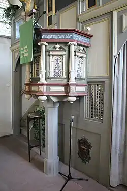 Die polygonale hölzerne Renaissance-Kanzel wurde um 1600 gefertigt. Die Auskragungen am unteren Kranzgesims bilden die Basen für die Freisäulen, die das obere Kranzgesims stützen. Auf dem oberen Fries ist der Bibelvers aus Lk 10,16 zu lesen. Säulen mit ionischen Voluten gliedern die Kanzelfelder, die mit ornamentalem Schnitzwerk unter Rundbogen verziert sind. ist Zwei Engel, die den verlorenen Schalldeckel ursprünglich gehalten haben, sind erhalten.[4]