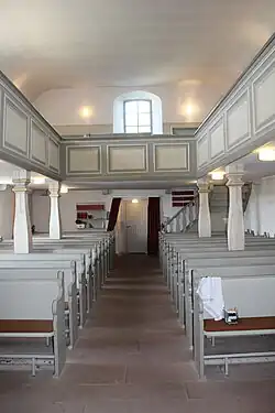 Das Innere wird von einer Spiegeldecke abgeschlossen. In das Kirchenschiff wurde 1784 eine dreiseitig umlaufende Empore eingebaut, die auf bauchigen viereckigen Pfosten ruht. Die Brüstung hat querrechteckige Füllungen. Die Kanzelwand von 1784 mit Orgelempore im Osten hat zwei Stichbogenöffnungen, links für den Treppenaufgang zur Orgelempore und zur Kanzel und rechts für die Sakristei.