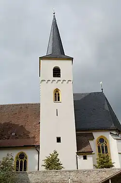 Die Saalkirche wurde 1496 anstelle einer Kapelle erbaut. Sie besteht aus einem Langhaus, einem eingezogenen, von Strebepfeilern gestützten, polygonal geschlossenen Chor und dem mit einem schiefergedeckten, achtseitigen Knickhelm bedeckten Chorflankenturm an dessen Ostwand. Im obersten Geschoss des Turms, oberhalb eines Bogenfrieses, steht der Glockenstuhl mit drei Glocken.[1]