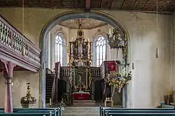 Der Innenraum des Langhauses ist mit einer Kassettendecke überspannt. Die barocke Kirchenausstattung stammt aus der Zeit um 1750.