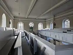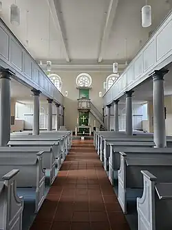 Die Holzbalkendecke und die Dachkonstruktion wurden im Zuge der letzten Renovierung 2006 vollständig erneuert. Im Innenraum ziehen sich Emporen an drei Seiten entlang, wodurch die Kapazität der Kirche erhöht wird.[2]