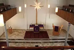 Der Innenraum wird von einer Flachdecke abgeschlossen. Der liturgische Bereich im Süden ist gegenüber dem Schiff um zwei Stufen erhöht. Die Südwand wird durch zwei Wandstützen gegliedert. Die holzsichtige Kirchenausstattung ist zeittypisch schlicht. Der Boden ist mit Fliesen in verschiedenen Grautönen belegt.