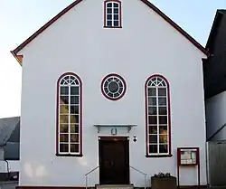 Das Innere wird durch Rundbogenfenster mit Sprossengliederung und einfachen Bleiglasfenstern belichtet. Zur Straßenseite im Osten sind drei Fenster eingelassen, zwei in der nördlichen Portalseite und zwei Fenster im Westen. In der nördlichen Westseite fehlt ein Fenster, da hier das Nachbarhaus unmittelbar an die Kirche grenzt. Das alte hochrechteckige Nordportal mit doppelflügeliger Holztür ist noch erhalten und erschließt über drei Stufen das Gotteshaus.[1] Der Türsturz trägt die Bauinschrift: „Dieses Haus Gottes ist mit der Hilfe Gottes erbaut worden im Jahr 1855.“ Darüber ist ein Rundfenster aus buntem Bleiglas eingelassen, das ein Kreuz mit dem dornengekrönten Haupt von Christus und der Kreuzesinschrift INRI zeigt. Im nördlichen Giebeldreieck dient ein kleines Fenster mit Stichbogen zur Belichtung des Dachbodens.