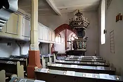 Der Innenraum wird von einer hölzernen Flachdecke abgeschlossen, die auf einem Längsunterzug ruht. Dieser wird von einer achtseitigen Mittelstütze mit Bügen getragen, die vermutlich aus gotischer Zeit stammt.[11] Die hölzerne Winkelempore im Nordwesten ruht auf vierkantigen Eichenpfosten mit Bügen. Ein kräftiger Spitzbogen öffnet den Chor zum Schiff.[9]