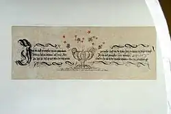 An der Südwand ist zwischen den beiden Fenstern ein Bibelspruch aus Sir 24,18+19+47  in schwarzer Frakturschrift mit einer großen Initiale gemalt: „Ich bin auffgewachsen wie ein palmbaum Am Wasser, Und wie die Rosenstöcke, So mann zu jericho erzeucht / Wie ein schöner Oelbaum auff freiem Felde Ich bin auf gewachsen wie Ahornen / Da sehet ihr, Daß ich nicht allein for mich arbeite, Sondern für alle die der Weisheit begehren, Sir 24 CVV18 · 19 · 47 ·“. Der Wandspruch wird von einer Schnörkelgirlande umrahmt und hat in der Mitte eine Henkelvase mit roten und schwarzen Blumen.