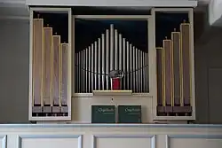 Eine erste Orgel wurde 1876 aus Niederhessen gebraucht erworben und von Orgelbauer Georg Friedrich Wagner aus Hersfeld instand gesetzt und eingebaut.[15] Das heutige Instrument baute Karl Lötzerich 1969.[12] Im flachen Prospekt stehen im quadratischen Mittelfeld Pfeifen des Prinzipal 4′ in pyramidenförmiger Anordnung. Zwei flankierende hochrechteckige Felder haben vorne je vier hölzerne Pfeifen des Subbass 16′. Das Instrument verfügt über sieben Register auf einem Manual und Pedal. Die Trakturen sind mit mechanischen Schleifladen ausgeführt. Die Orgel weist folgende Disposition auf: