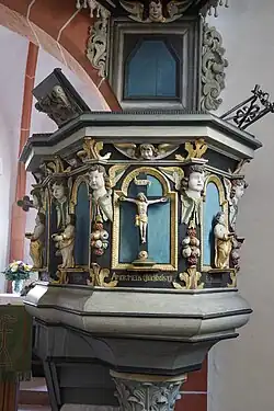 Die wuchtige polygonale Kanzel aus dem Jahr 1713 am südlichen Chorbogen fertigte Meister Josias Wolrat Brützel aus Korbach mit ländlichen Schnitzereien.[11] Der reich verzierte Kanzelkorb ruht auf einer Rundsäule, die in der oberen Hälfte mit Akanthusblättern verziert ist. Die Kanzelfelder haben vergoldete hochrechteckige Füllungen mit einem Rundbogen. Die Kanzelfelder werden durch geflügelte Engelköpfe mit Fruchtgehängen gegliedert. Darüber und darunter vermittelt je ein vergoldetes Akanthusblatt zu den profilierten Kranzgesimsen. Das mittlere Kanzelfeld zeigt den Gekreuzigten mit der Inschrift INRI. Unterhalb der Füllung ist als Inschrift zu lesen „AMOR MEUS CRUCIFIXUS EST“ (Meine Liebe ist der Gekreuzigte). Die flankierenden Kanzelfelder zeigen die vier Evangelisten mit der aufgeschlagenen Bibel. Die Kanzelrückwand leitet zum sechsseitigen Schalldeckel über, dessen Form mit dem Kanzelkorb korrespondiert. An der Unterseite ist eine weiße Taube in einem vergoldeten Strahlenkranz angebracht. Die beiden Kranzgesimse werden durch geflügelte Engelköpfe und unter den Auskragungen durch vergoldete Akanthusblätter verbunden. Eine Volutenkrone mit Früchten wird von einem vergoldeten Pelikan bekrönt, der sich die blutende Brust aufreißt und seine drei Jungen nährt, Symbol für Christus, der sein Leben dahingibt. Der Kanzelzugang wird um den Pfeiler herumgeführt.