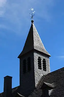 Dem verschindelten Satteldach sind an der Nordseite drei kleine Gauben und mittig ein schlanker, verschindelter Dachreiter aufgesetzt. In den quaderförmigen Schaft sind die Schallöffnungen für das Geläut eingelassen. Der vierseitige Spitzhelm wird von einem Turmknauf, einem verzierten Kreuz und einem Windrichtungsanzeiger bekrönt.