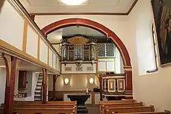 Die Kirchenausstattung wird einheitlich durch die Farben Rot, Ocker und Weiß beherrscht. Im Inneren ruht die Flachdecke auf dem runden Chorbogen in roter Fassung mit ockerfarbenen Profilen und hölzernen Wandpfeilern.[1] Durch den Bogen wird die Nordempore geführt. Die Empore ruht auf roten Holzpfosten mit ockerfarbenen Bügen und hat eine ockerfarbene Brüstung mit weißen, querrechteckigen Füllungen. Die schmale Westempore trägt in den Füllungen die Bibelverse „WO BIST DU? 1. Mose 3“ und „WO IST DEIN BRUDER? 1. Mose 4“. Die östliche Chorempore dient als Aufstellungsort für die Orgel.