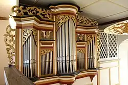 Im Jahr 1701 errichtete ein unbekannter Orgelbauer eine neue Orgel. Friedrich Dreuth baute 1798–1800 ein seitenspieliges Instrument, das über zehn Register auf einem Manual und Pedal verfügte. Der fünfachsige Prospekt hat einen überhöhten runden Mittelturm und außen zwei Spitztürme. Die überleitenden Pfeifenflachfelder haben Kämpferleisten, über denen ein geflügelter Engelskopf angebracht ist. Ein profiliertes Kranzgesims wird bis zum Mittelturm durchgezogen. Das untere Gesims hat unter den drei Türmen Konsolen, deren mittlere von einem geflügelten Engelskopf gestützt wird. Durchbrochenes Rankenwerk bildet die seitlichen Blindflügel und den bekrönenden Gehäuseaufbau. Orgelbau Friedrich Weigle ersetzte das Innenwerk 1930 unter Einbeziehung des historischen Barockprospekts. Später wurde ein freistehender Spieltisch unter der Orgelempore aufgestellt und die pneumatische Traktur elektrifiziert. Nach einem Umbau durch Orgelbau Hardt lautet die Disposition mit sieben Registern wie folgt:[9]