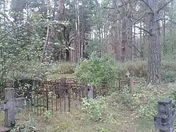 Gegenüber dem Pfarrhaus[7] am Schulgarten lag der alte, etwa 300 m² große evangelische Friedhof, der auch heute noch – ein wenig verwahrlost – existiert. Er unterstand der evangelischen Kirche. Der Kommunalfriedhof, der um die Wende 19./20. Jahrhundert angelegt wurde, befand sich außerhalb des Dorfes an der Straße nach Willenberg (Wielbark).