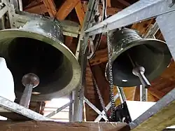 Die beiden größeren Glocken wurden am 7. September 1859 abgehängt, nachdem die kleine Vaterunserglocke schon vorher zerbrochen war. Die größere Glocke war 1511 von dem Butzbacher Bürger Ludwig Calvert (oder Calvort) geschaffen worden. Friedrich Otto aus Gießen goss zwei neue Glocken mit Inschriften, die am 13. September aufgehängt wurden. Die größere Glocke trug Inschriften mit dem Bibelvers aus Lk 2,14 und den Namen von Pfarrer, Bürgermeister und den Glockengießern, die kleinere Inschriften mit denselben Namen und den Worten „Wachet und betet“ (Mt 26,41 ).[11] Nachdem 1917 die Glocken für die Kriegsindustrie abgeliefert werden mussten, ließ die Gemeinde 1922 drei neue Glocken gießen und dabei eine von 1450 stammende Glocke einschmelzen.[12] Die beiden 1942 konfiszierten Glocken wurden 1950 durch zwei neue von Friedrich Wilhelm Schilling (gis1, 338 kg und h1, 207 kg) ersetzt.[13]