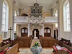 Der alte hölzerne Taufstein und der Kronleuchter wurden zwanzig Jahre später wiederentdeckt und in das Gotteshaus zurückgebracht. Allerdings hatte die Kirche inzwischen einen modernen Marmor-Taufstein erhalten, sodass der alte, achteckige Taufstein in Formen des Klassizismus einen weniger prominenten Platz im Langhaus erhielt. Der neue Altar beherrscht den Chor. Er wurde 1960 geschaffen und greift die alte Form des Kanzelaltars auf. Oberhalb eines schlichten Aufbaus bildet der Gekreuzigte den Abschluss.[4]